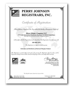 Direct Metals® Company, LLC will supply our customers with products which meet or exceed customer's quality and delivery requirements. We will comply with all non-excluded requirements of the ISO 9001:2015 Standard and will continually improve our quality management system processes to meet customer needs and expectations.